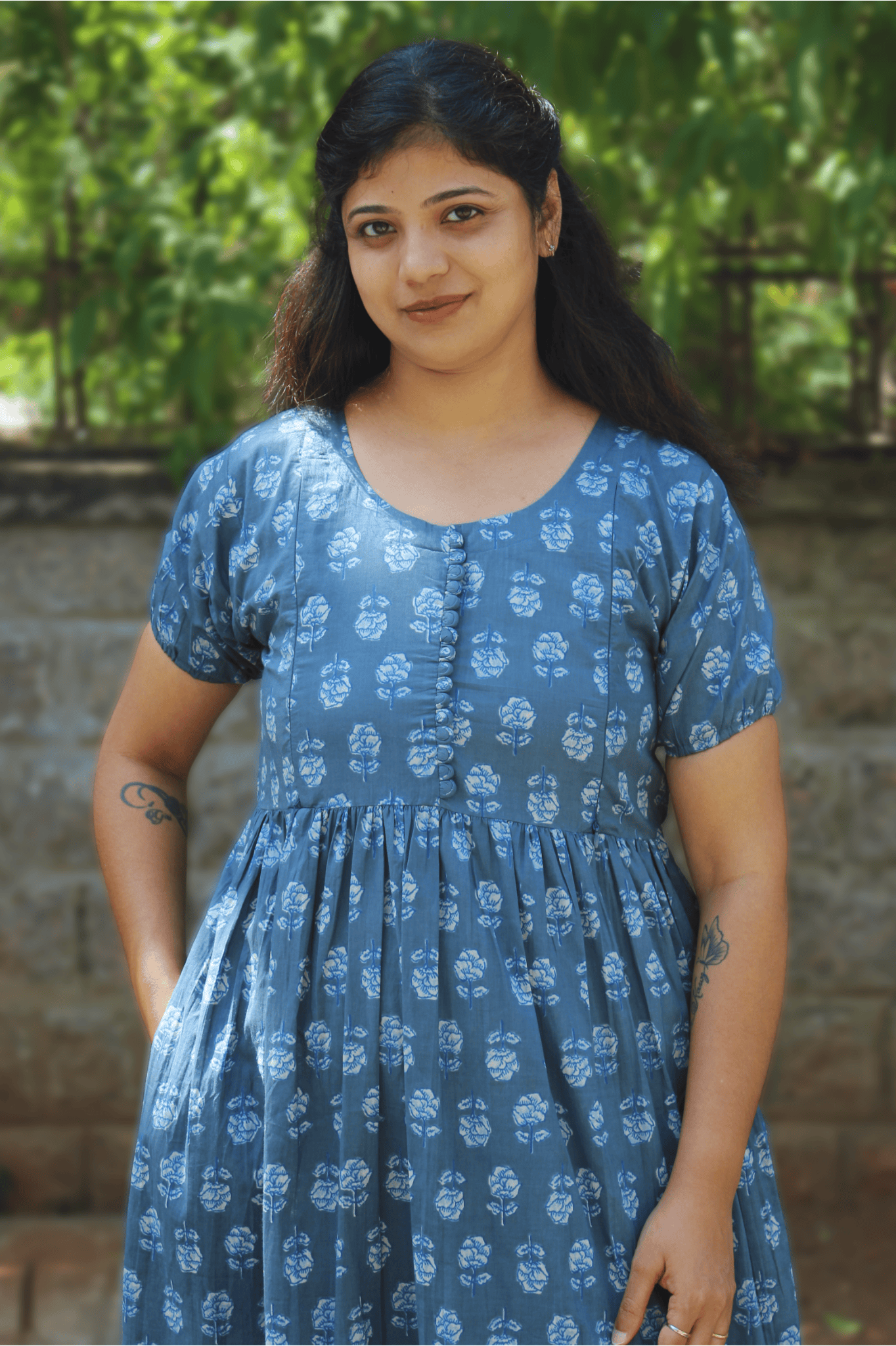 Color & Print: Soft Blue base with an all-over White/Light Blue Block Print in a repeating small floral motif.