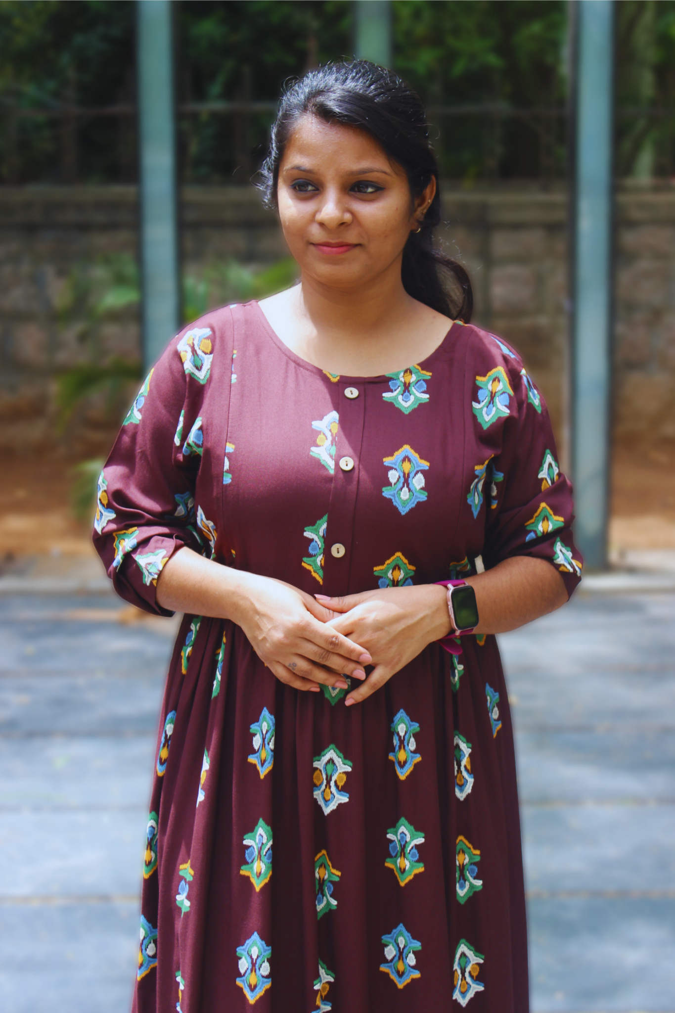 Overall Vibe: The dress has a casual and comfortable feel, but the rich color and striking print give it a more distinct and stylish look. It is suitable for a relaxed day out, a casual gathering, or a comfortable yet fashionable day at work.
