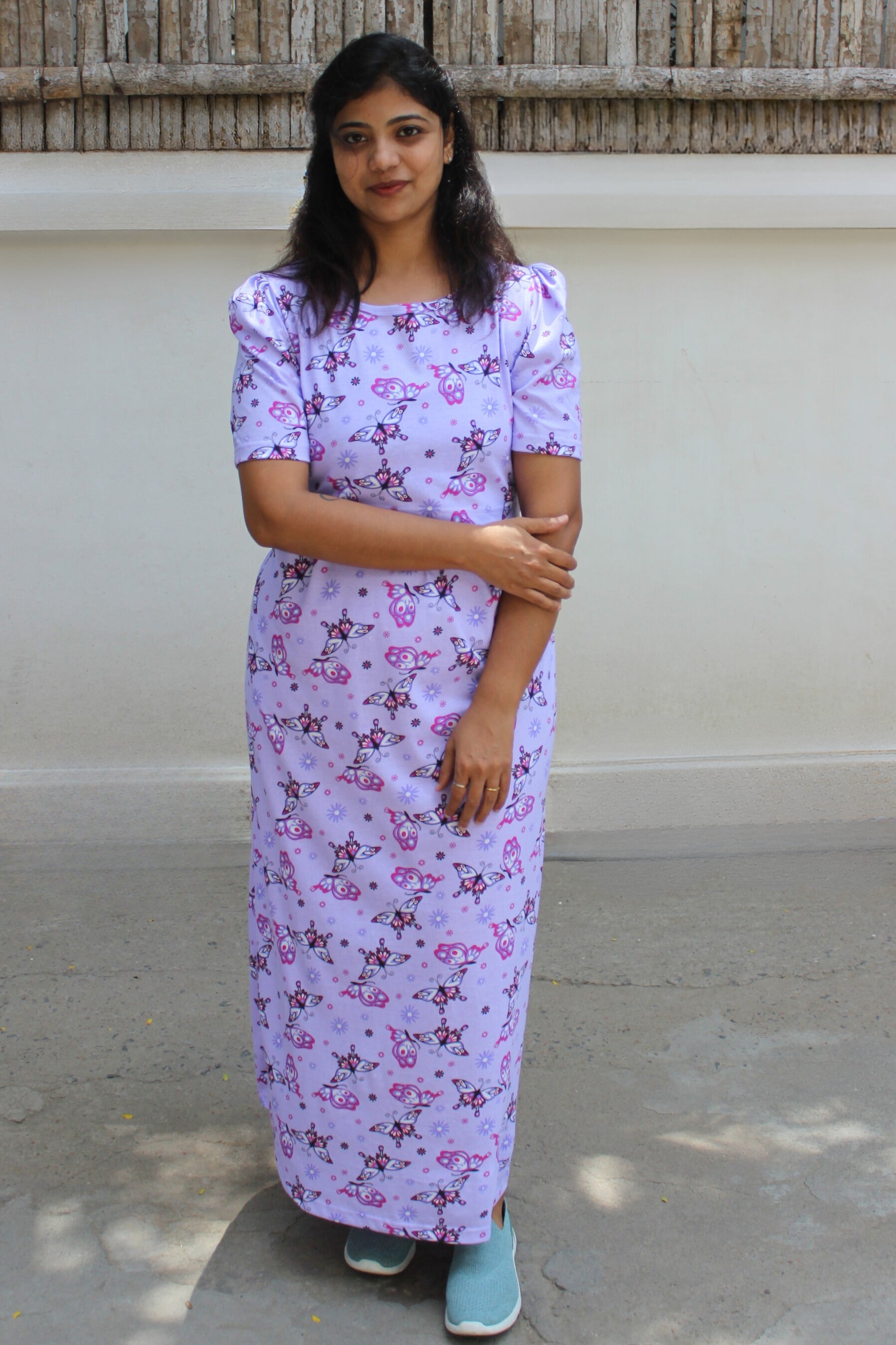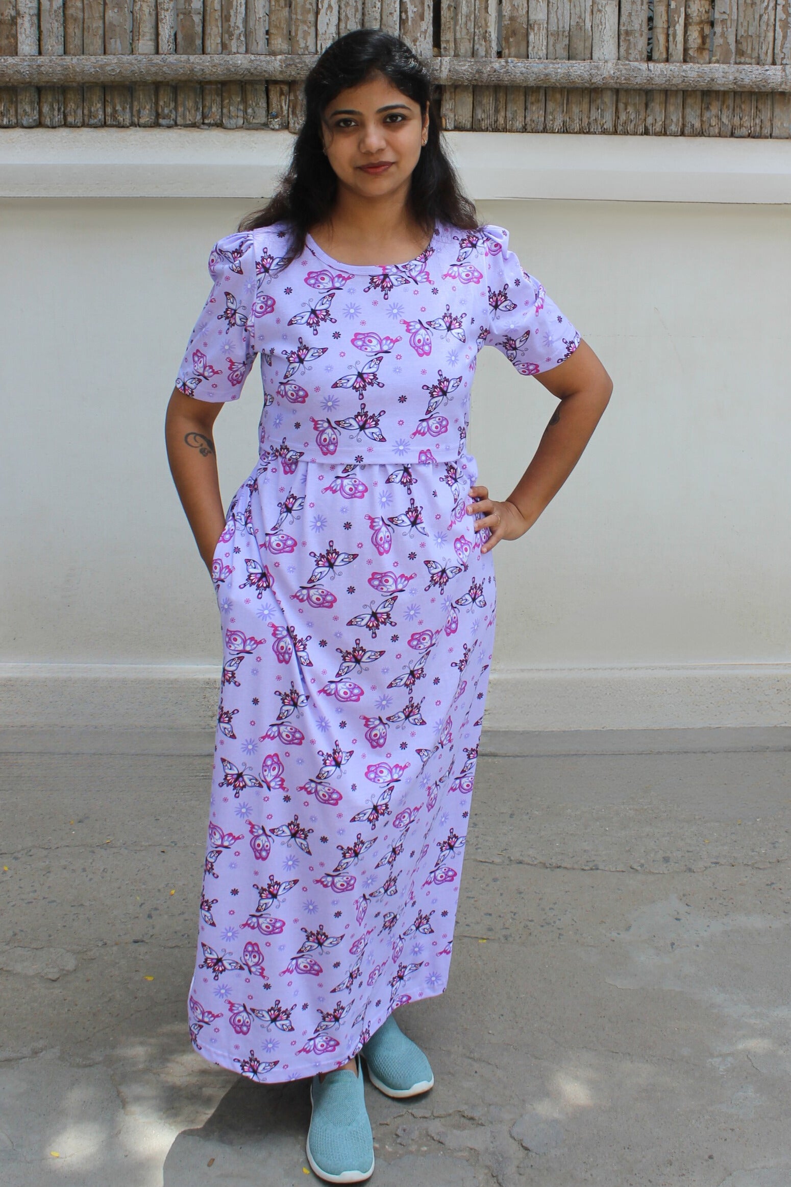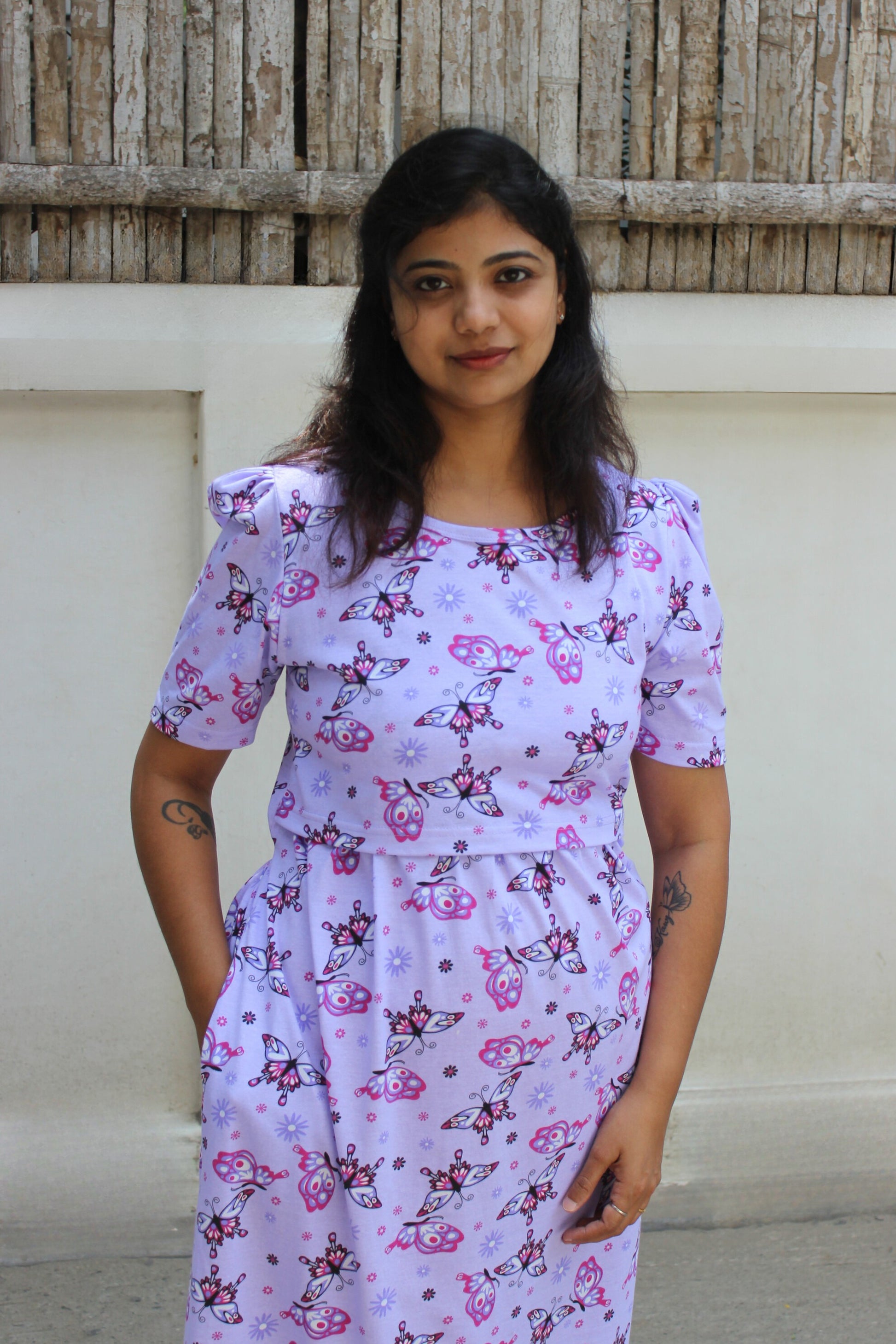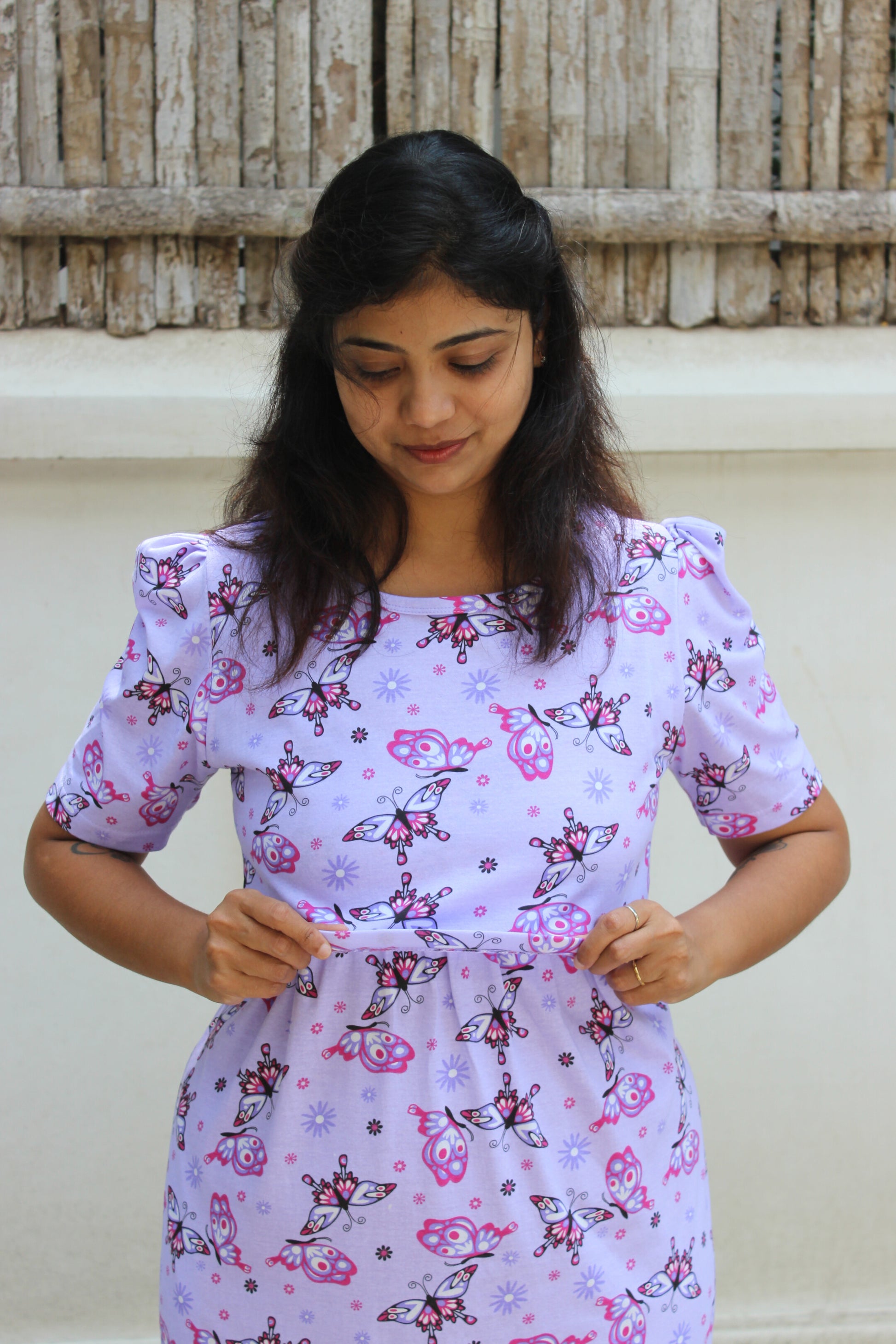 Lilac Flutter Zipless Maternity Wear, designed specifically for expecting mothers. This casual wear piece offers a seamless design without zippers, ensuring no pressure or discomfort on your baby bump. Crafted for both style and functionality, it allows effortless movement and breathability throughout your day. Ideal for everyday wear, this floral outfit supports your changing body while keeping you looking effortlessly chic.