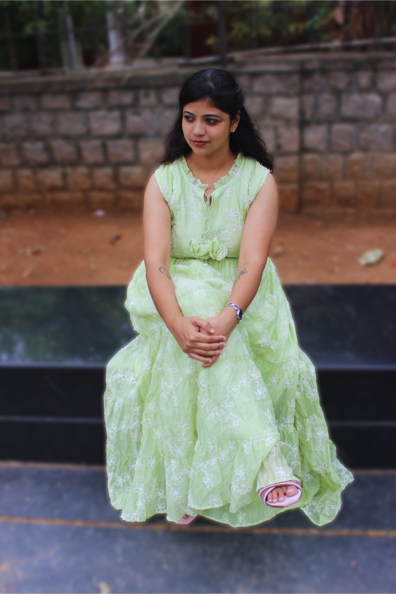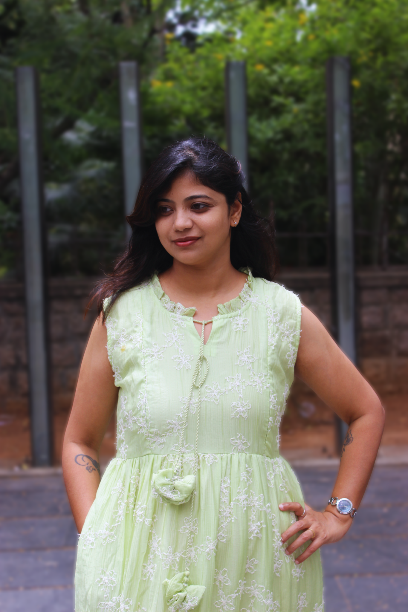 Pattern: Intricate white embroidery covers the entire dress, featuring a floral or chikan work pattern. The fabric also has a crinkled or textured finish.